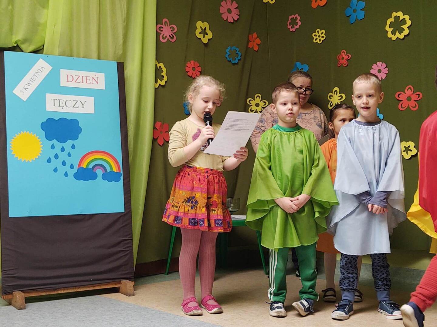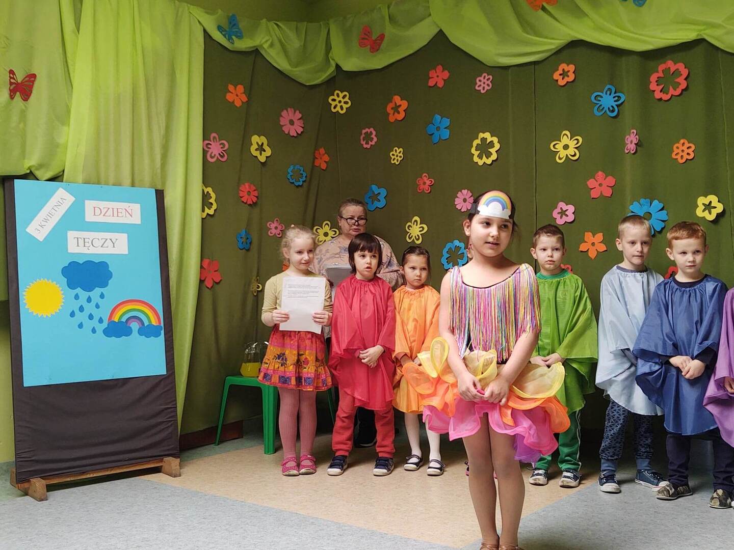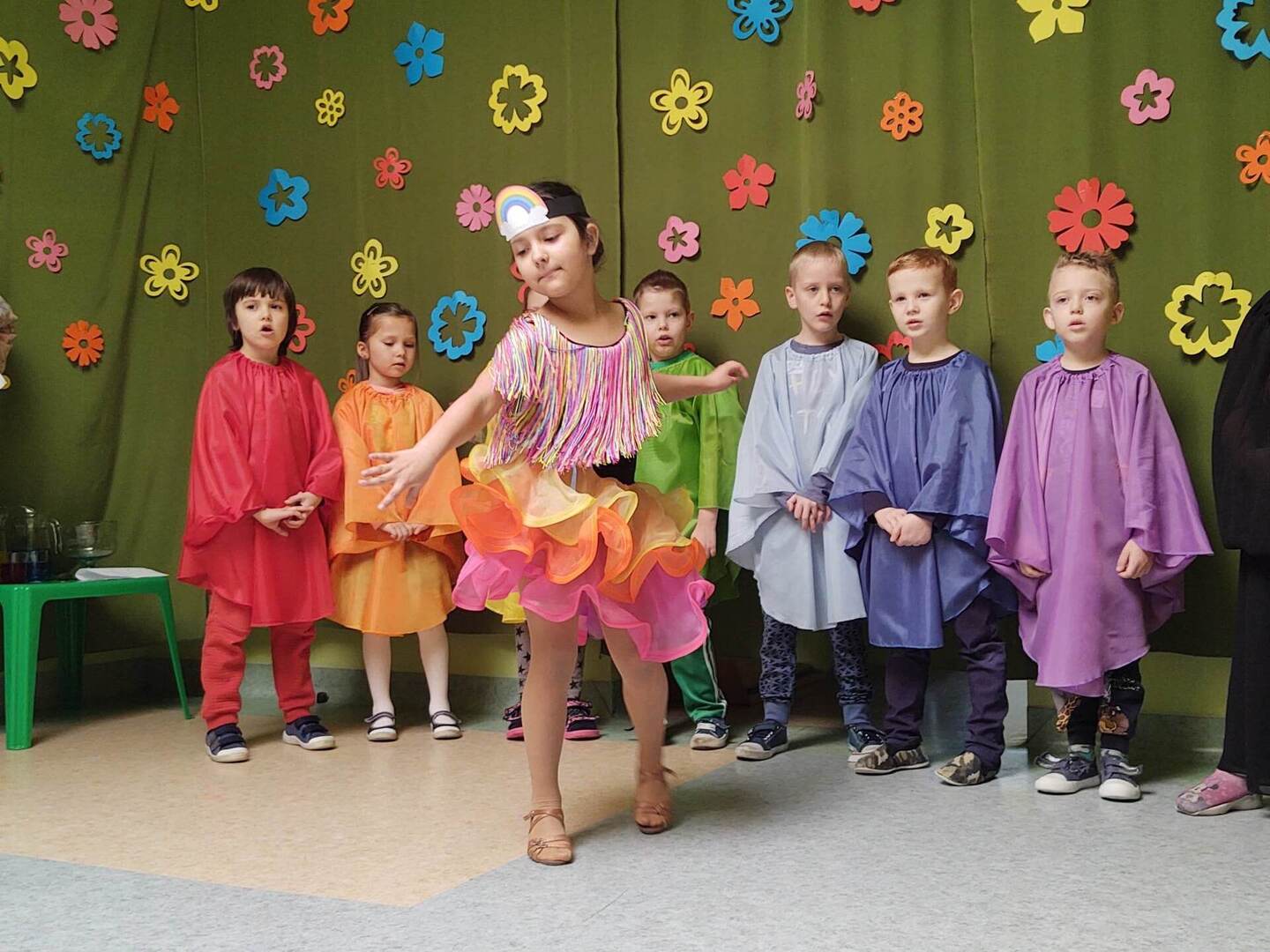 3 kwietnia w naszym przedszkolu obchodzony był DZIEŃ TĘCZY. Dzieci z grupy "Stokrotki" zaprezentowały inscenizację wiersza "Historia tęczy", dzięki której przedszkolaki utrwaliły wszystkie kolory siedmiobarwnego łuku i przekonały się, że w przyrodzie każdy kolor jest bardzo ważny i potrzebny a wszystkie razem tworzą niepowtarzalnie piękne zjawisko na niebie. Były też eksperymenty, podczas których sprawdzaliśmy jak powstają kolory pochodne z połączenia barw podstawowych. Na zakończenie tego wyjątkowego i kolorowego dnia Amelka, zatańczyła cza-czę do piosenki "Tęcza".