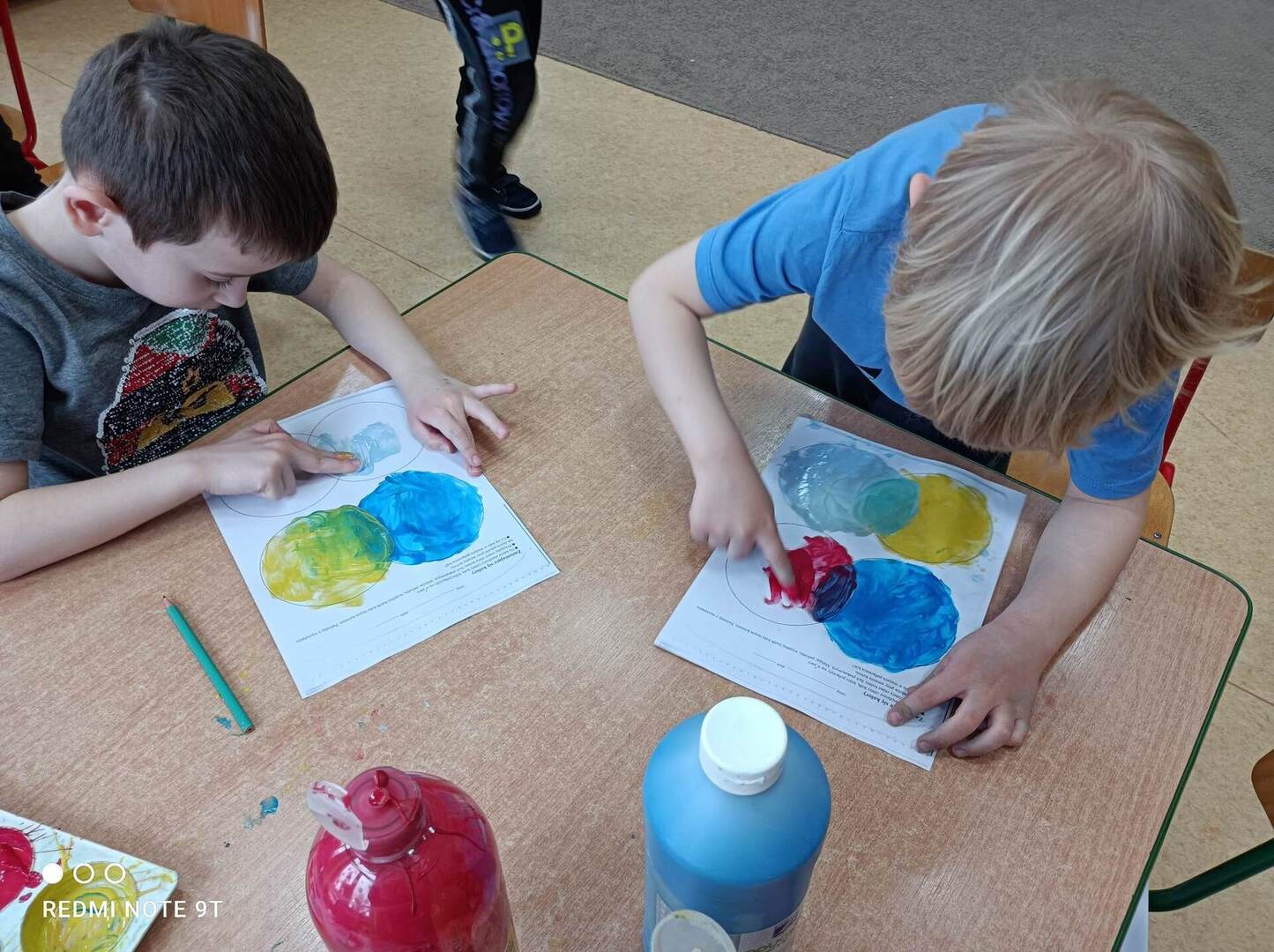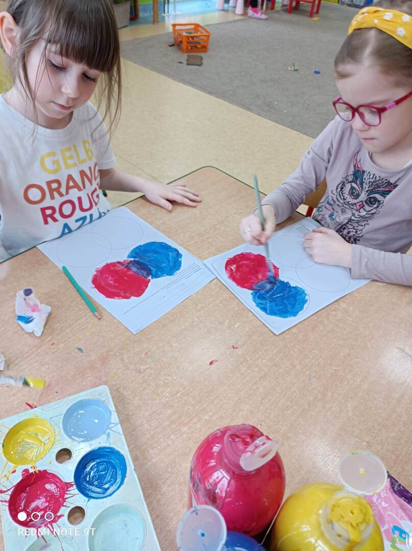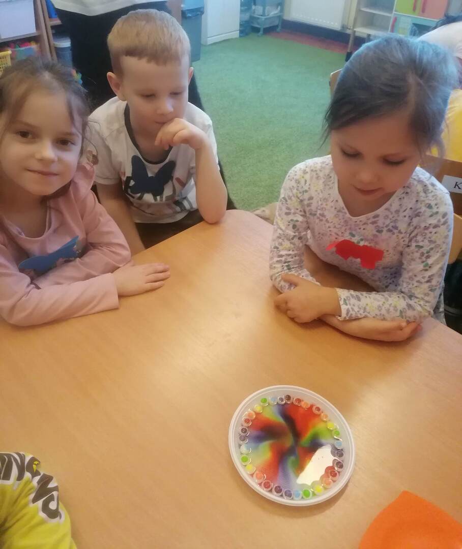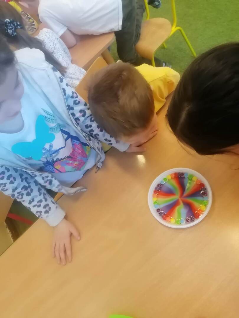 - Dzieci z grupy "Stokrotki" wykonały doświadczenia „tęcza na talerzu” oraz „wędrujące kolory”.