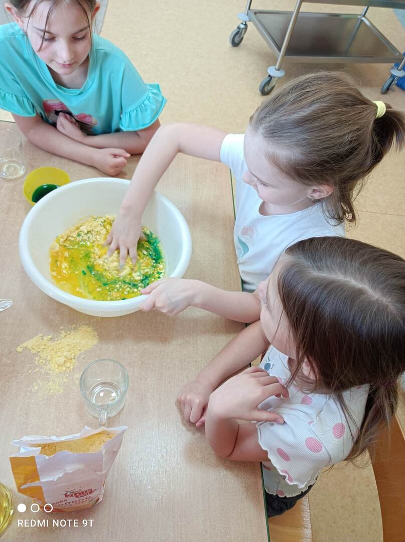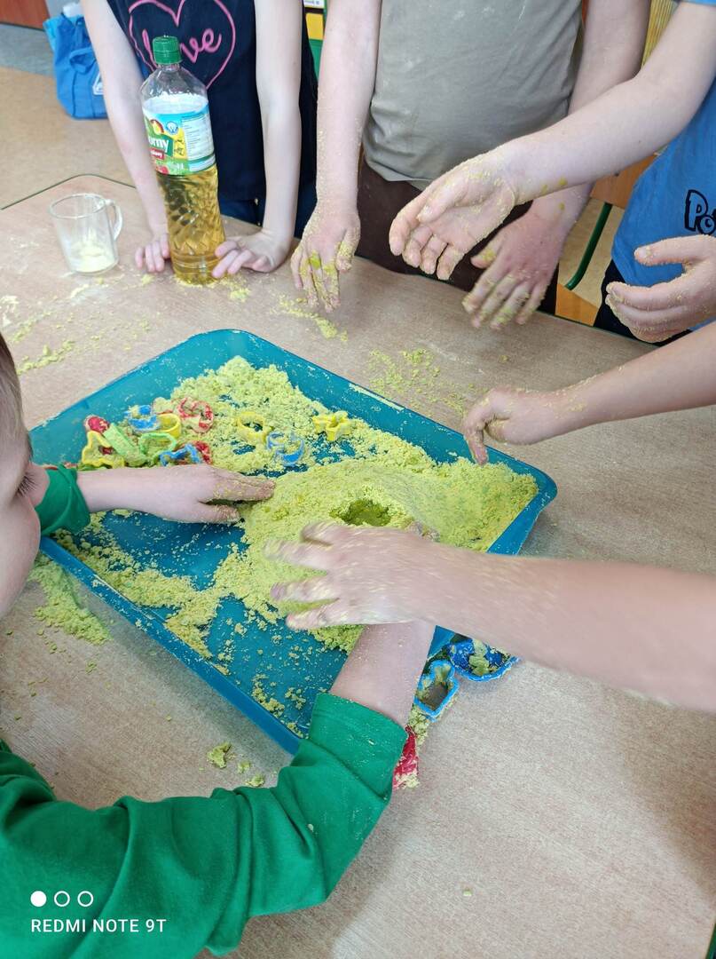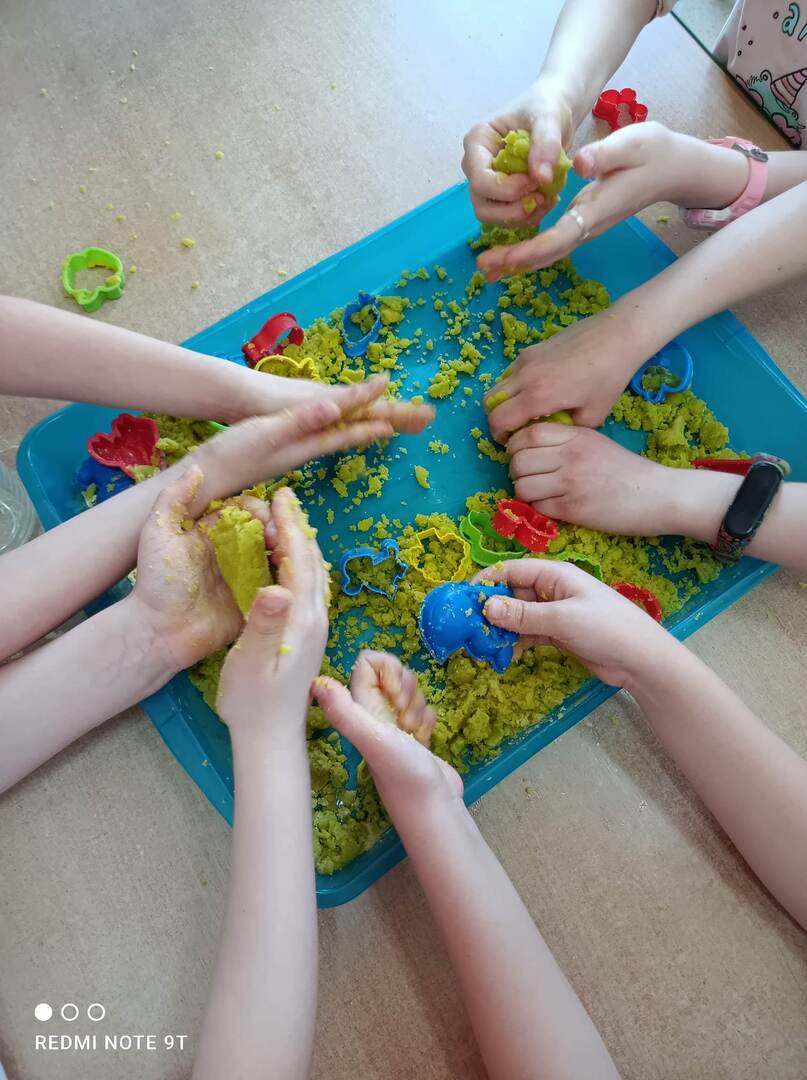 - Dzieci z grupy "Biedronki" stworzyły „piasek kinetyczny” i mieszały kolory.