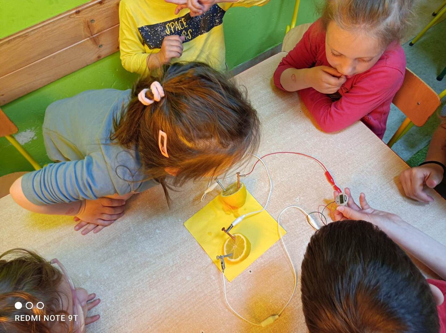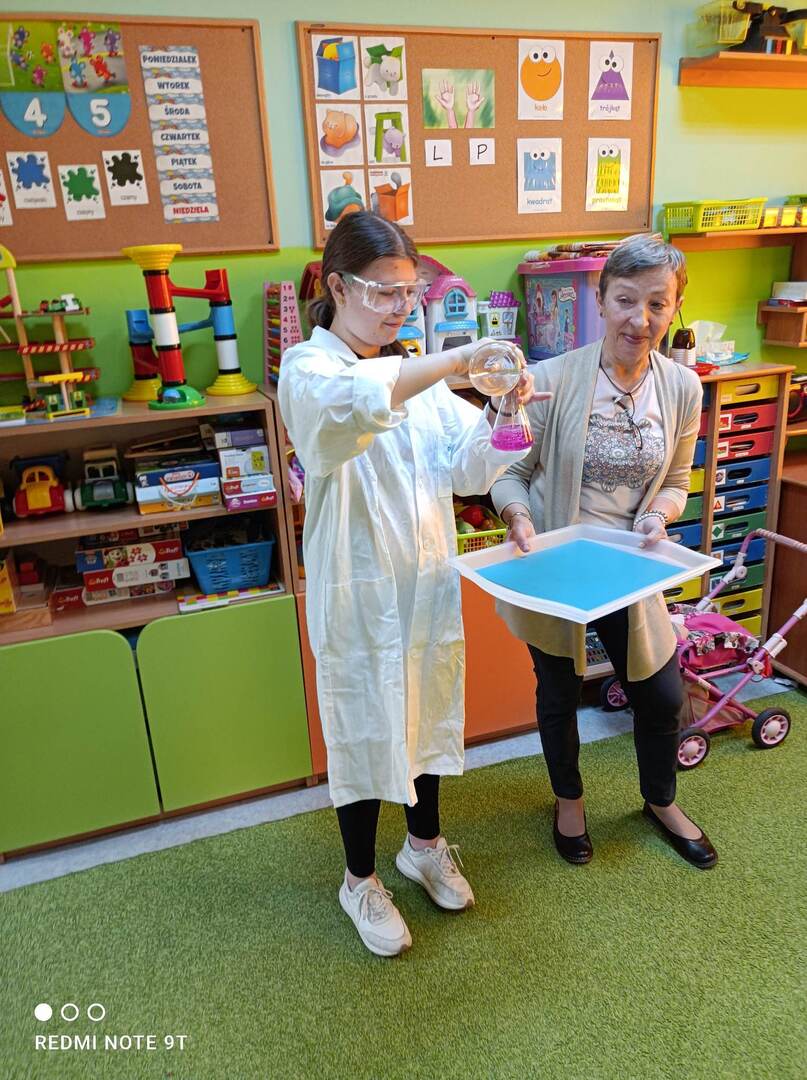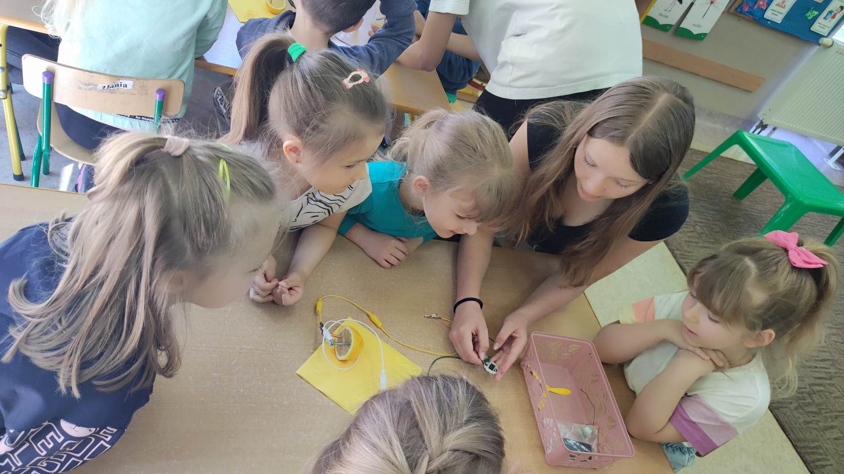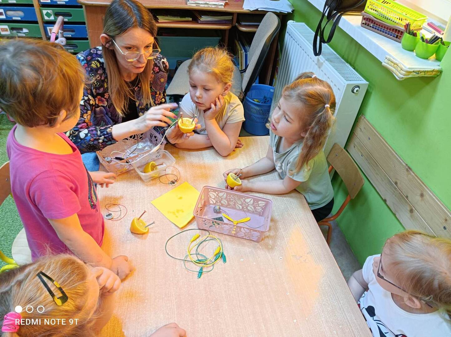 12 maja do naszego przedszkola zawitali goście ze Szkoły Podstawowej w Różycy. Pani Jolanta Molińska (nauczycielka chemii) i pani Malwina Cichecka (nauczycielka fizyki) wraz z uczennicami z klasy 7b poprowadziły doświadczenia mające na celu w ciekawy sposób przybliżyć przedszkolakom zagadnienia z fizyki i chemii. Dzieci, pracując w grupach, wykonały doświadczenie polegające na wytworzeniu prądu z cytryny, sprawdziły jak działa panel fotowoltaiczny. Przedszkolaki zobaczyły również eksperymenty chemiczne podczas których bezbarwna ciecz zmieniała kolory.