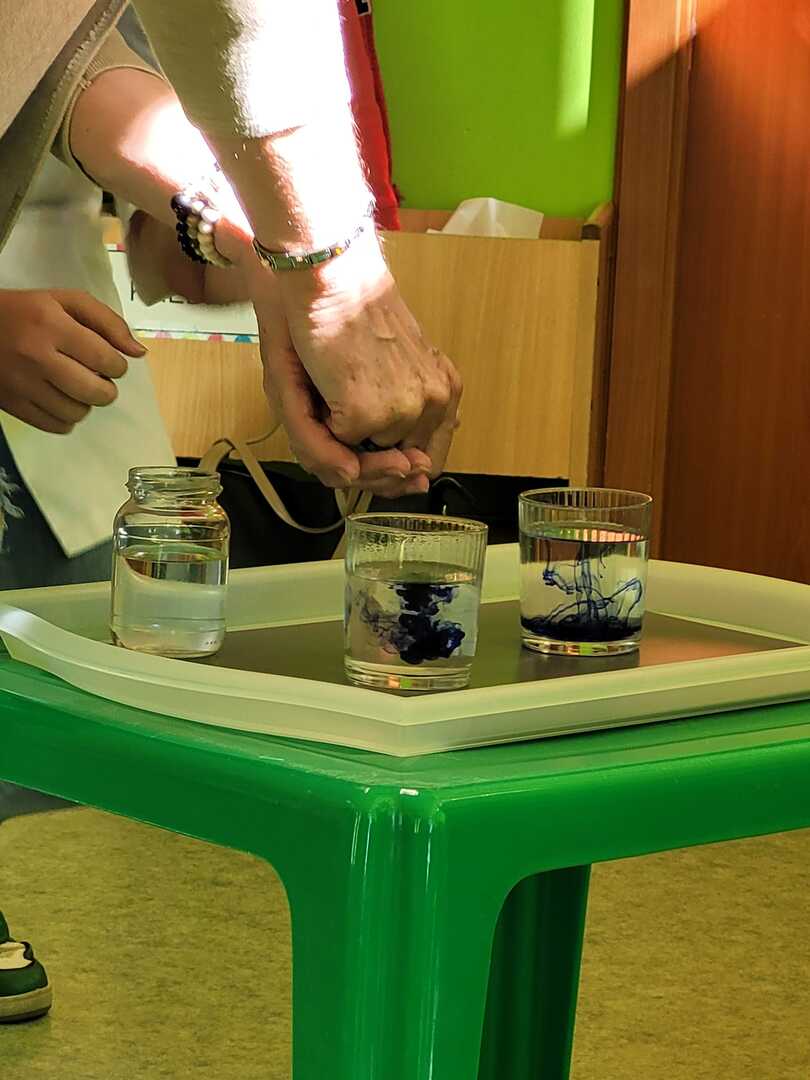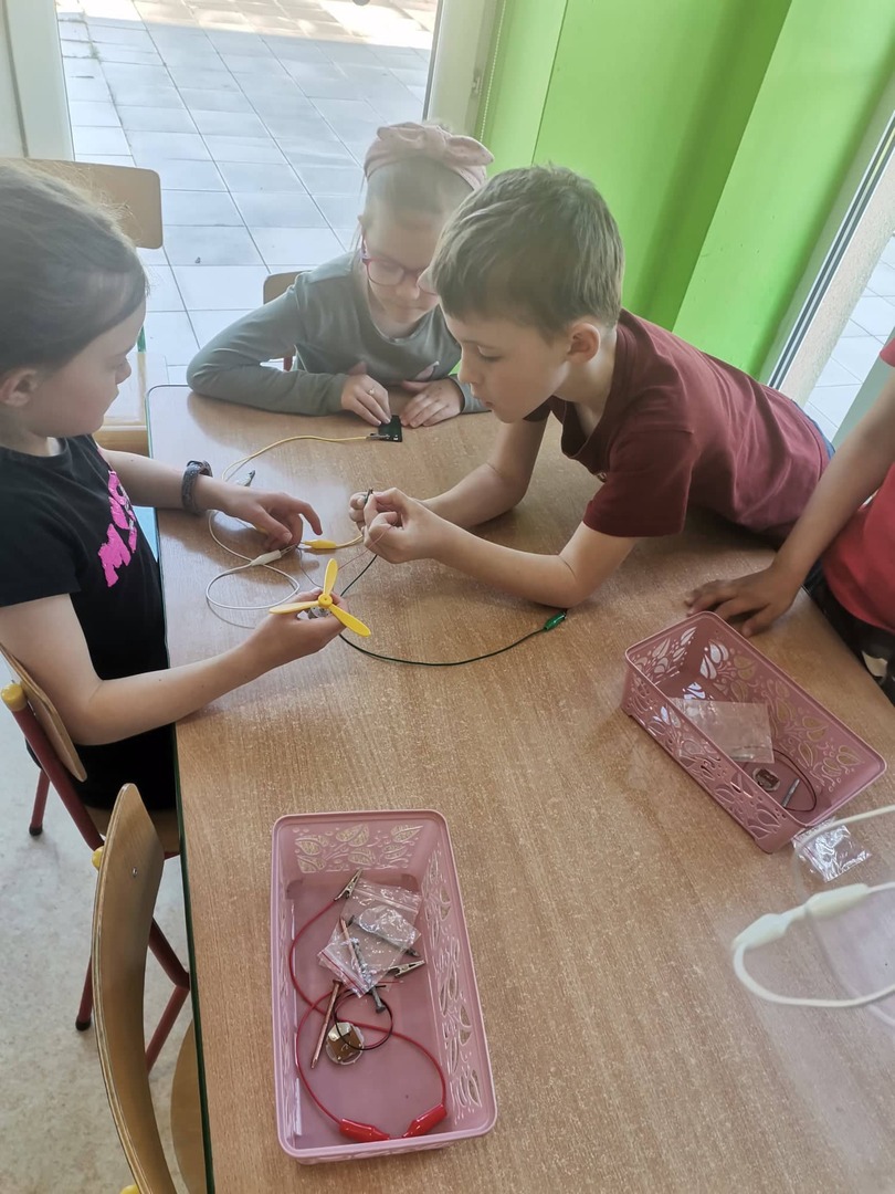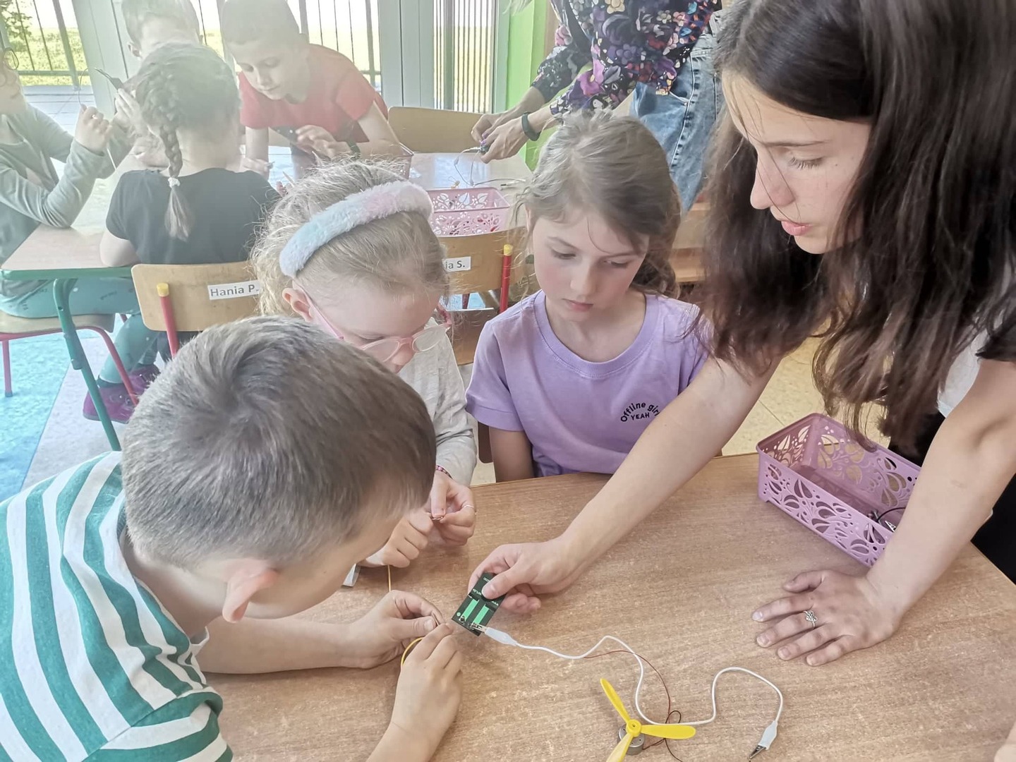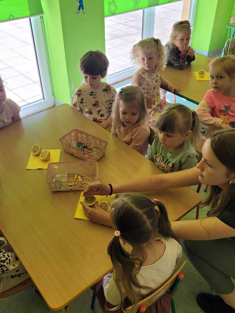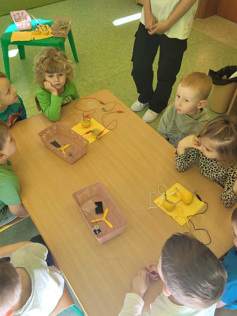 12 maja do naszego przedszkola zawitali goście ze Szkoły Podstawowej w Różycy. Pani Jolanta Molińska (nauczycielka chemii) i pani Malwina Cichecka (nauczycielka fizyki) wraz z uczennicami z klasy 7b poprowadziły doświadczenia mające na celu w ciekawy sposób przybliżyć przedszkolakom zagadnienia z fizyki i chemii. Dzieci, pracując w grupach, wykonały doświadczenie polegające na wytworzeniu prądu z cytryny, sprawdziły jak działa panel fotowoltaiczny. Przedszkolaki zobaczyły również eksperymenty chemiczne podczas których bezbarwna ciecz zmieniała kolory.